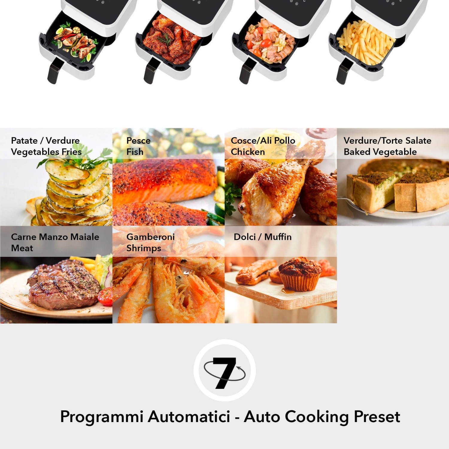 Può funzionare in modalità manuale, impostando la temperatura (80° – 200° C) o scegliendo tra gli 8 programmi predefiniti.