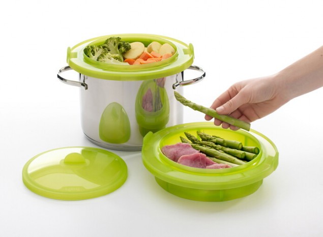 La vaporiera a due strati di Lekué, permette di cucinare in modo sano e veloce più alimenti alla volta, ognuno con il proprio giusto punto di cottura, mantenendo le vitamine ed esaltandone i loro sapori. Si adatta apentole dal diametro di 19-22cm.