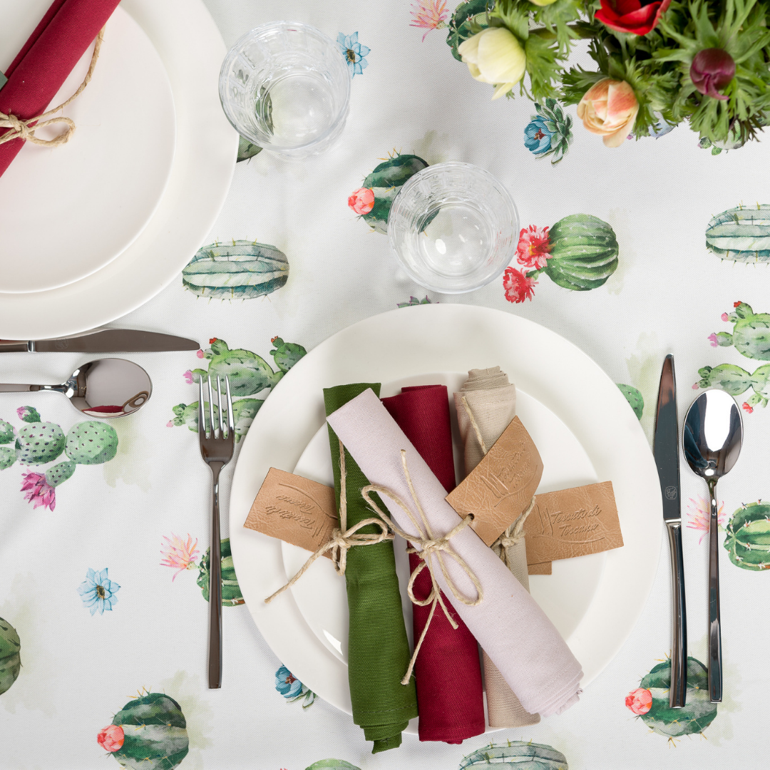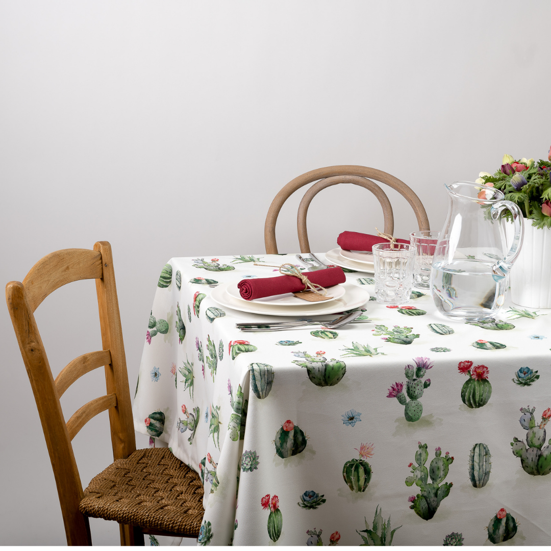 La Tovaglia antimacchia cactus è realizzata in un particolare tessuto tecnico antimacchia e antipiega.