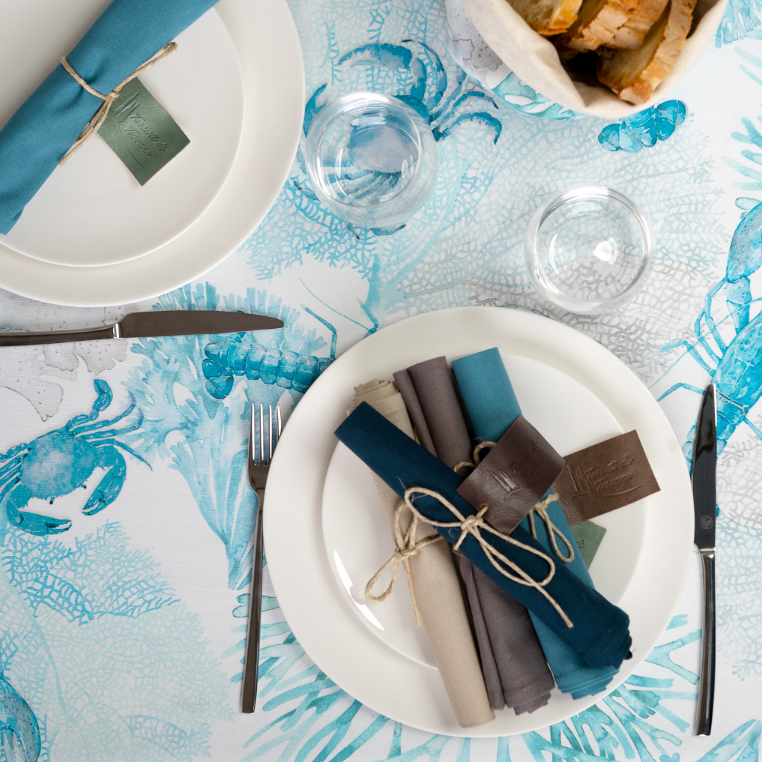 La tovaglia può essere impreziosita con i tovaglioli in cotone coordinati, disponibili in molti colori in abbinamento o a contrasto con la palette colori base del decoro: blu navy, blu avio, beige ecc.