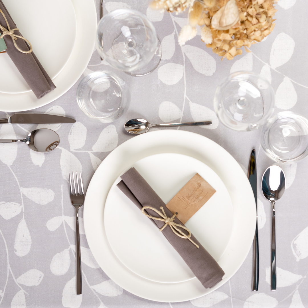 La tovaglia può essere arricchita con i tovaglioli in cotone coordinati, disponibili in molti colori in abbinamento o a contrasto con la palette colori base del decoro: grigio, sabbia, ecc.