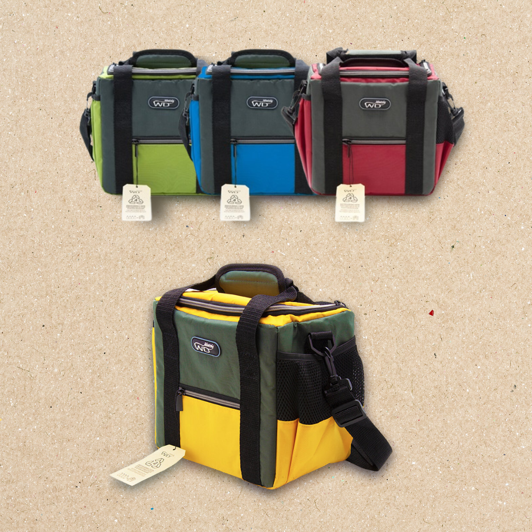 Borsa termica con tessuto in PET riciclato. Disponibile nei seguenti colori: bianco, verde, blu, rosso, arancione e nelle seguenti capacità : 8l